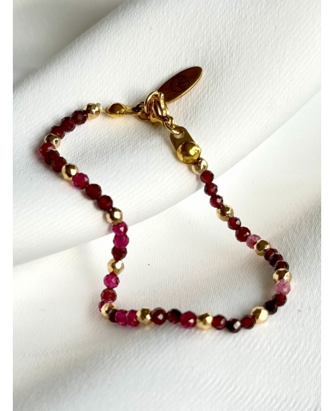 A delicate, handcrafted bracelet made of natural garnets interwoven with gold-plated hematite. Garnet – a stone of passion and courage – captivates with its deep, raspberry hue, beautifully contrasting with the warm glow of gold. The adjustable surgical steel clasp ensures the bracelet fits most wrists.
