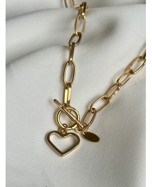 A subtle yet expressive necklace crafted from surgical steel. It features a fashionable chain with large, rectangular links and a striking toggle clasp with a heart-shaped pendant. The simple design, combined with an elegant gold color, creates the perfect addition to any outfit.