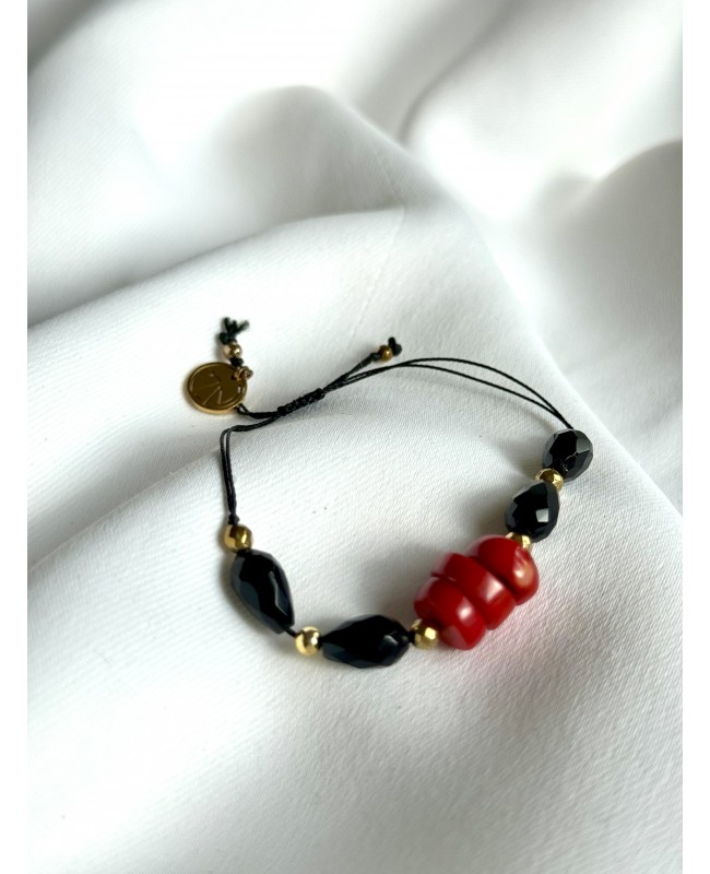 A distinctive, handmade bracelet that combines elegance and energy. The focal point is three natural corals in a vibrant red hue, surrounded by faceted black onyx beads. Subtle gold accents add a touch of elegance and subtle sparkle.