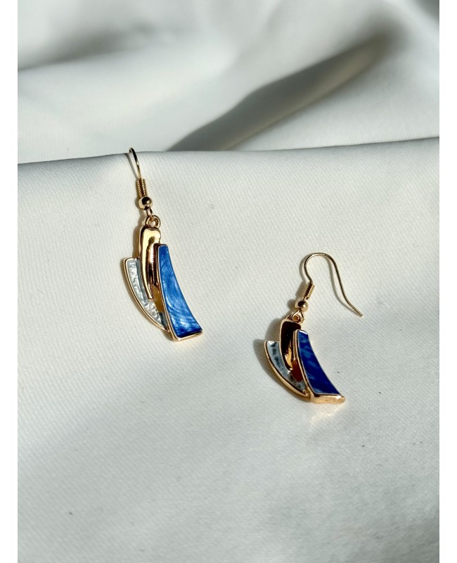 These unique drop earrings combine gold, deep blue, and a delicate pearl shimmer to create a harmonious, stylish ensemble. Their asymmetrical, wavy shape lends them a modern touch and makes them eye-catching with their subtle sparkle.