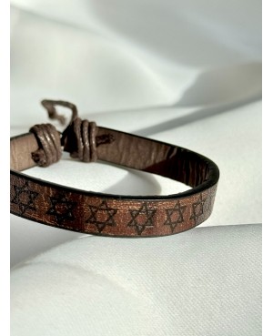 This stylish bracelet is made of brown faux leather, adorned with a repeating geometric pattern in the form of six-pointed stars. The subtly distressed leather texture adds character and makes it look exceptionally striking.
