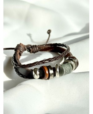 A stylish men's bracelet with a raw, natural character. Crafted from a combination of dark brown faux leather and braided cord, it creates an interesting, multi-layered effect. The decorative composition of metal, wooden, and stylized beads gives it a distinctive, tribal feel.