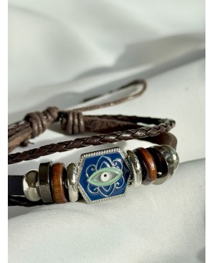 This distinctive and stylish men's bracelet is crafted from a combination of dark brown faux leather, a braided cord, and a variety of metal and wooden beads. The centerpiece is a hexagonal medallion with an enameled protective eye motif in shades of navy blue, green, and white. This symbol has been considered a talisman for centuries, bringing good luck and protecting against negative energy.