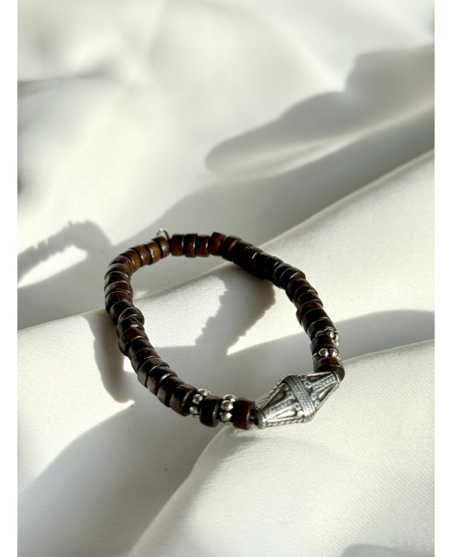 The "Tribal Shield" bracelet is a unique accessory in a natural style that combines the rawness of wood with the ethnic elegance of metal details. Crafted from dark brown, cylindrical beads, it presents a stylish and minimalist look while maintaining a distinct character.