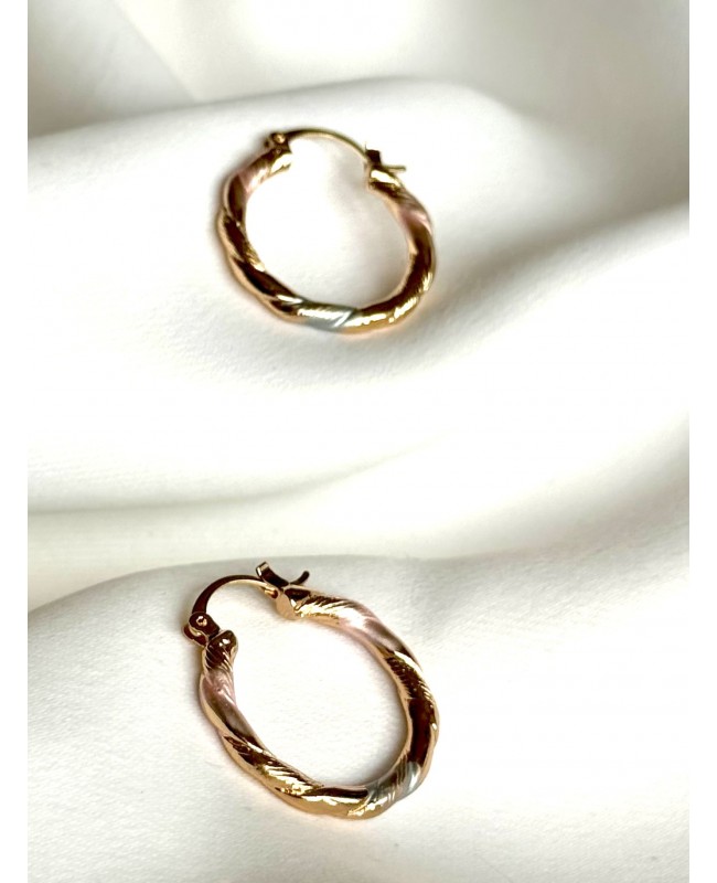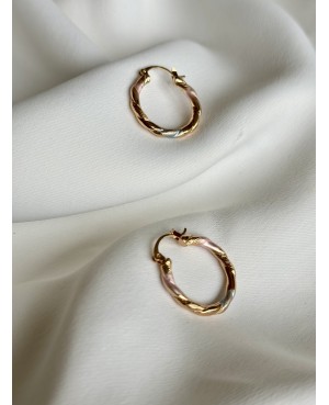 Klasyka w nowoczesnym wydaniu – te kolczyki w formie kółek zachwycają subtelnym, skręconym splotem i połączeniem trzech kolorów: złotego, srebrnego i różowego złota. Dzięki temu są niezwykle uniwersalne i pasują do każdej biżuterii, niezależnie od jej odcienia. Lekka forma i wygodne zapięcie sprawiają, że możesz nosić je przez cały dzień.