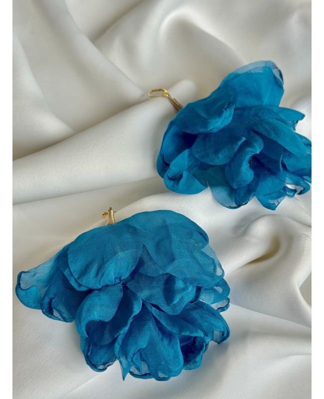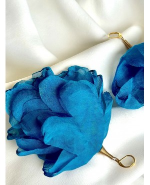 Wyjątkowe kolczyki w formie dużych, ręcznie formowanych kwiatów z lekkiej, półtransparentnej tkaniny w intensywnym odcieniu błękitu. Ich imponująca forma dodaje charakteru każdej stylizacji, a jednocześnie pozostaje niezwykle lekka i wygodna w noszeniu.