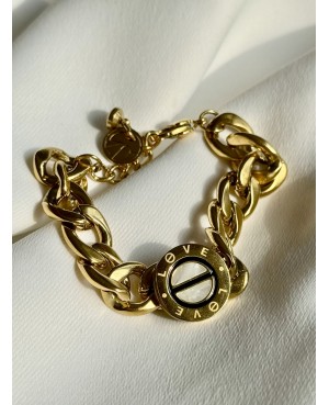 Wyrazista, złota bransoletka, która doda charakteru każdej stylizacji. Gruby łańcuch w połączeniu z okrągłą zawieszką z napisem LOVE i subtelną perłową wstawką tworzy nowoczesny, modowy akcent. Idealna dla kobiet, które lubią biżuterię przyciągającą wzrok.