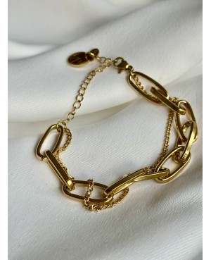 Nowoczesna bransoletka w kolorze złota z efektownymi, podłużnymi ogniwami i delikatnym łańcuszkiem, który dodaje całości lekkości. Jej geometryczna forma sprawia, że świetnie komponuje się zarówno z eleganckimi, jak i casualowymi stylizacjami.