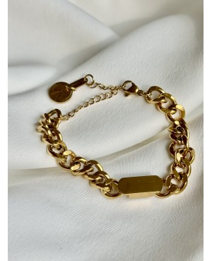 Stylowa, złota bransoletka z klasycznym, masywnym splotem i subtelną blaszką, która może pełnić funkcję ozdobną lub zostać spersonalizowana grawerem. Idealny wybór dla osób ceniących ponadczasowy design i elegancję w minimalistycznym wydaniu.