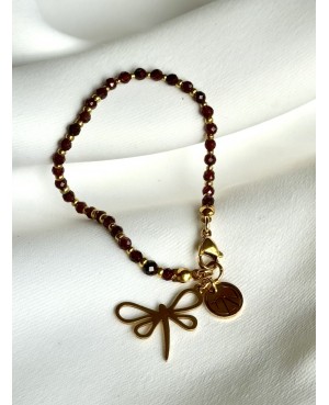 Unikalna bransoletka wykonana z fasetowanych kamieni granatu w głębokim, bordowym odcieniu. Subtelne złote elementy pięknie komponują się z kamieniami, dodając całości blasku i elegancji. Główną ozdobą jest złota zawieszka w kształcie ważki – symbolu lekkości, wolności i siły przemiany.