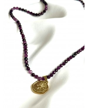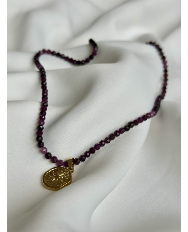 Dodaj swojej stylizacji wyjątkowego charakteru dzięki eleganckiemu naszyjnikowi wykonanemu z naturalnych granatów w odcieniach głębokiej czerwieni i burgundu. Subtelnie fasetowane kamienie pięknie odbijają światło, nadając całości luksusowego blasku.