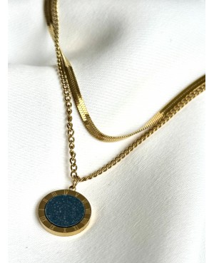 Stylowy i ponadczasowy naszyjnik warstwowy, który łączy dwa różne sploty – subtelny łańcuszek i elegancki płaski łańcuszek typu „snake”. Całość dopełnia okrągły medalion w kolorze głębokiej czerni, osadzony w złotej oprawie z delikatnym grawerem. To idealna propozycja dla osób, które lubią nowoczesne, ale wciąż klasyczne dodatki.