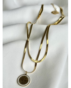 Wyjątkowy naszyjnik w odcieniu złota, składający się z delikatnego łańcuszka typu snake chain oraz zawieszki w kształcie medalionu. Środek ozdobiony jest misternym wzorem inspirowanym sztuką orientalną, otoczonym połyskującymi kryształkami, które pięknie odbijają światło.