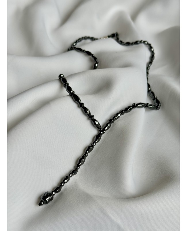 Minimalistyczny i elegancki naszyjnik wykonany z naturalnych, fasetowanych kamieni hematytu. Charakterystyczny połysk i ciemnoszara barwa nadają mu nowoczesnego, lekko industrialnego charakteru. Całość uzupełnia niewielka zawieszka w kształcie głowy Buddy – symbolu spokoju i harmonii.