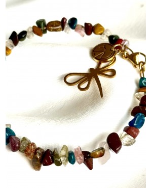 Kolorowa bransoletka stworzona z naturalnych kamieni w różnych barwach – od głębokiej czerwieni, przez błękit i zieleń, aż po ciepłe odcienie ziemi. Każdy kamień jest niepowtarzalny, dzięki czemu każda bransoletka ma swój unikalny charakter. Ozdobiona została złotymi akcentami oraz zawieszką w kształcie ważki – symbolem wolności, lekkości i przemiany.