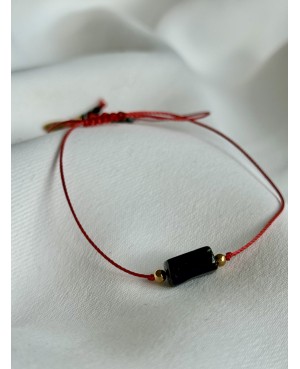 Wyrazista bransoletka, która łączy w sobie symbolikę i elegancję. Na środku umieszczony jest gładki, czarny kamień w kształcie walca, który kontrastuje z intensywną czerwienią sznurka i subtelnymi złotymi akcentami.