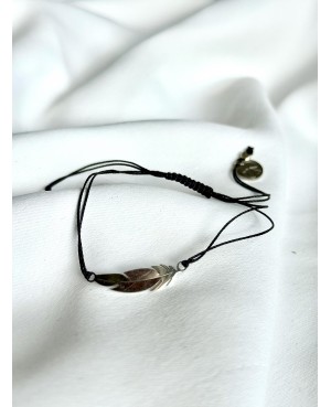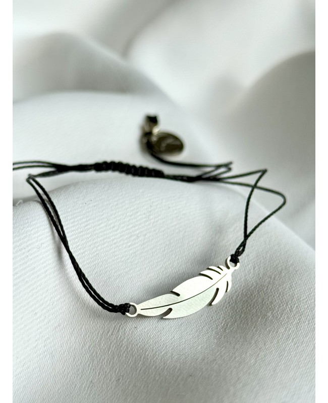 Delikatna, minimalistyczna bransoletka na czarnym, regulowanym sznurku z elegancką zawieszką w kształcie piórka w kolorze srebrnym. Idealna jako subtelny dodatek do codziennych stylizacji – pasuje zarówno do casualowego looku, jak i bardziej eleganckich zestawów.