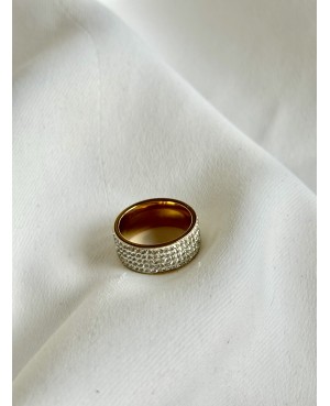 Jeśli szukasz biżuterii, która zachwyca elegancją i przyciąga spojrzenia – ten pierścionek jest idealnym wyborem. Szeroka, złota obrączka została ozdobiona poczwórnym rzędem lśniących cyrkonii, które pięknie odbijają światło, tworząc efekt luksusowego połysku.