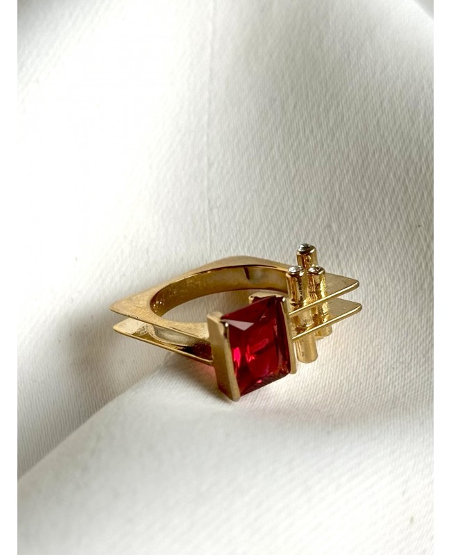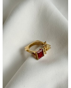 Nowoczesny i odważny pierścionek w kolorze złota, który zachwyca unikalnym wzornictwem. Centralnym punktem jest intensywnie czerwony kryształ w szlifie prostokątnym, oprawiony w geometryczną ramę. Asymetryczne, architektoniczne zdobienia nadają całości futurystyczny charakter i sprawiają, że biżuteria staje się wyjątkowym dodatkiem.