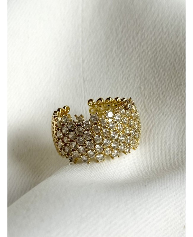Olśniewający pierścionek o bogatym zdobieniu, który przyciąga uwagę intensywnym blaskiem. Wykonany w kolorze złota i w całości pokryty rzędami drobnych, lśniących cyrkonii, pięknie odbija światło i dodaje elegancji każdej stylizacji. Dzięki regulowanej obrączce pierścionek łatwo dopasowuje się do palca, zapewniając komfort noszenia.