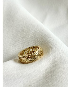 Stylowy złoty pierścionek o wyjątkowym ażurowym wzorze, który łączy w sobie elegancję i subtelną nutę romantyzmu. Delikatne zdobienia w formie ornamentów nadają mu lekkości i ponadczasowego uroku, a połyskujące cyrkonie na obrzeżach pierścionka dodają mu blasku i elegancji.