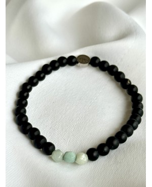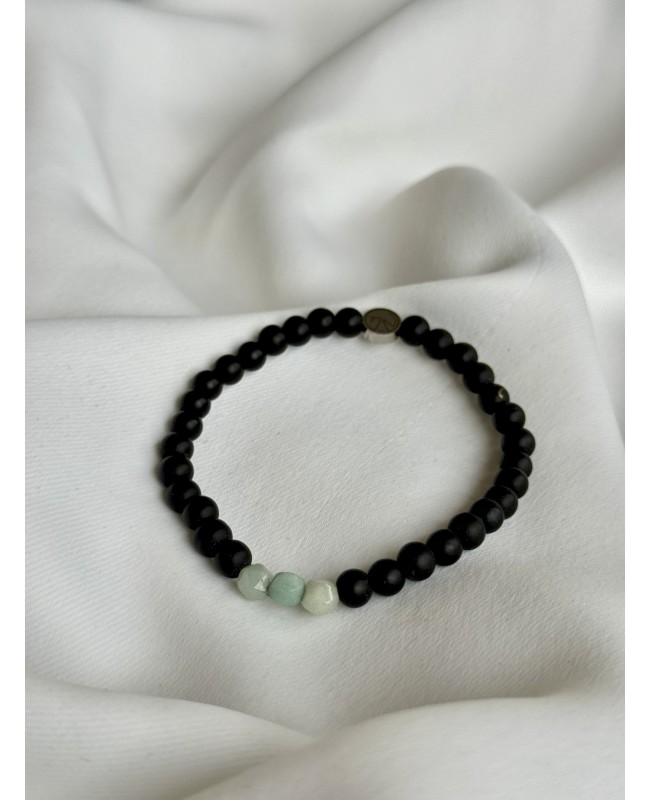 Minimalizm, elegancja i harmonia – ta bransoletka to doskonały wybór dla osób ceniących prostotę z nutą wyjątkowości. Wykonana z matowych kamieni onyksu w głębokiej czerni, przełamanych trzema subtelnymi koralikami z naturalnego amazonitu w odcieniach zieleni i błękitu.