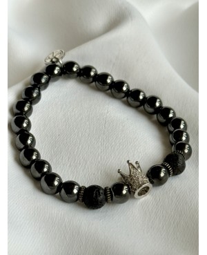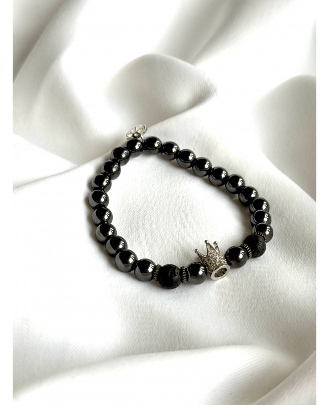 Elegancja i moc w jednym – ta wyjątkowa bransoletka została wykonana z naturalnych kamieni hematytu i lawy wulkanicznej, ozdobiona efektowną srebrną koroną. To połączenie klasy, siły i królewskiego charakteru, które podkreśli Twój indywidualny styl.