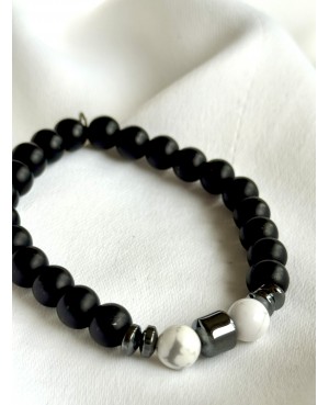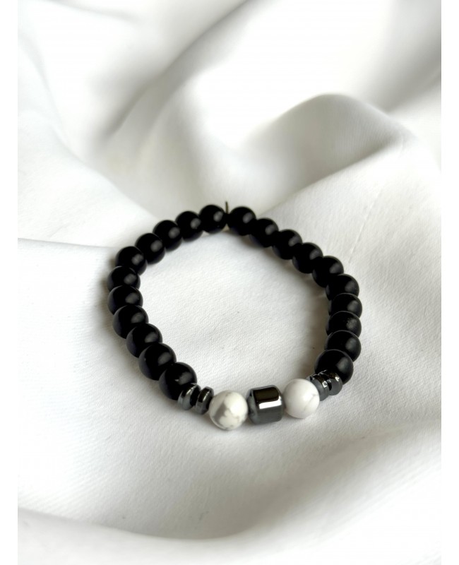 Minimalistyczna bransoletka, która łączy w sobie elegancję i harmonię naturalnych kamieni. Wykonana z czarnego onyksu, symbolu siły i pewności siebie, oraz białego howlitu, znanego ze swoich właściwości uspokajających i równoważących energię. Centralny element stanowi hematyt, który dodaje całości subtelnego, metalicznego połysku.