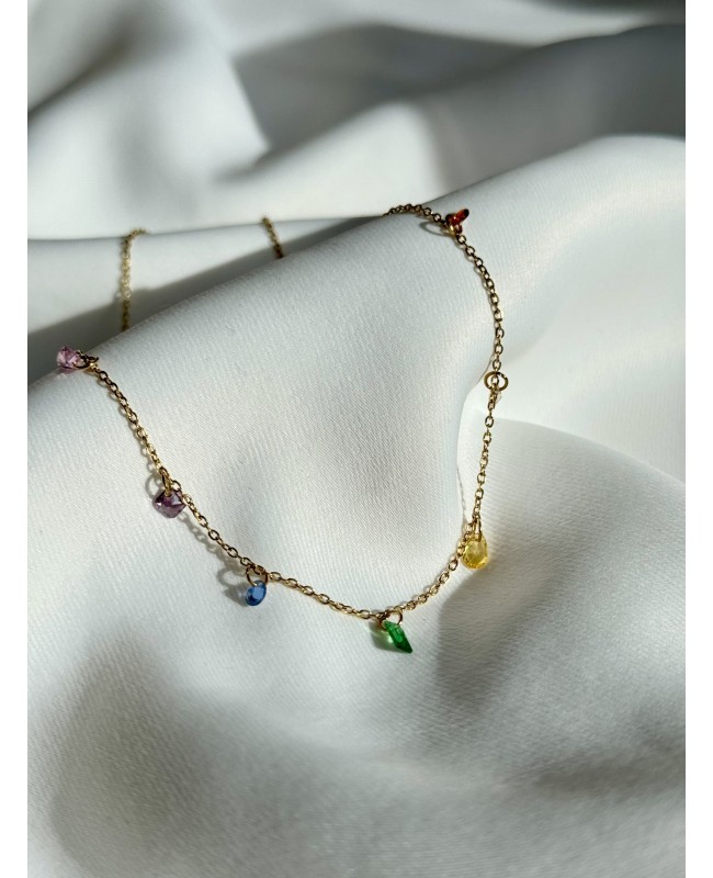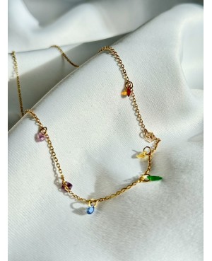 Delikatny naszyjnik, który zachwyca lekkością i radością kolorów. Na cienkim, złoconym łańcuszku zawieszono drobne kryształki w różnych odcieniach – zielonym, niebieskim, żółtym, fioletowym i czerwonym. Każdy z nich pięknie odbija światło, tworząc efekt subtelnego blasku przy każdym ruchu.