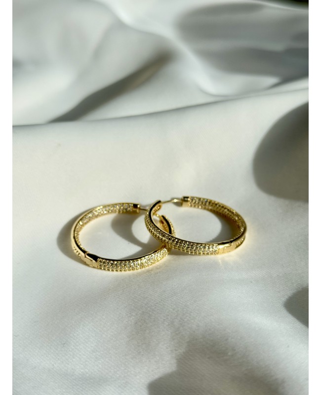 Ponadczasowe kolczyki w formie kół, które łączą elegancję klasyki z blaskiem nowoczesnego stylu. Wykonane w kolorze złota, ozdobione zostały lśniącymi, drobnymi cyrkoniami rozmieszczonymi na całej powierzchni, dzięki czemu pięknie odbijają światło i przyciągają spojrzenia.
