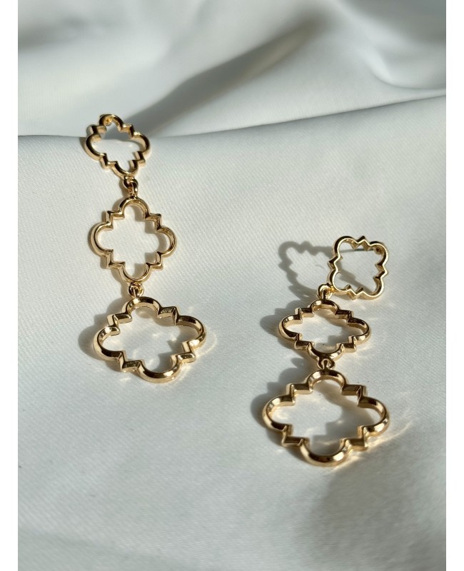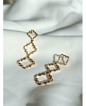 Stylowe kolczyki w kolorze złota z delikatnymi, ażurowymi zawieszkami w kształcie czterolistnej koniczyny to połączenie klasyki i kobiecego uroku. Ich lekka, geometryczna forma pięknie się porusza przy każdym ruchu, dodając blasku i elegancji nawet najprostszej stylizacji.