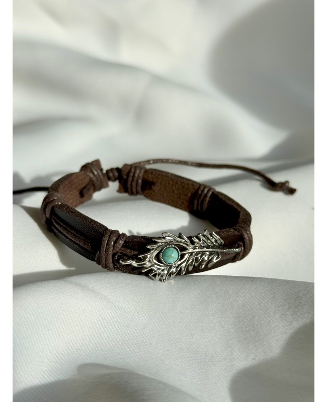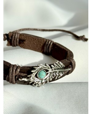 Stylowa bransoletka o wyjątkowym klimacie boho, wykonana z ciemnobrązowej skóry ekologicznej. Jej centralnym elementem jest srebrna ozdoba w kształcie pióra, w której osadzono turkusowy kamień – symbol wolności, harmonii i pozytywnej energii.