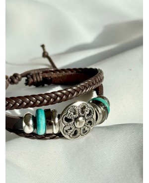 Bransoletka męska „Turquoise Flower” – skórzana, pleciona, z ozdobnym medalionem