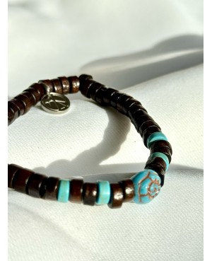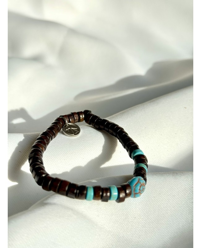 Lekka, naturalna i pełna pozytywnej energii — bransoletka „Turquoise Spirit” łączy ciemnobrązowe drewniane koraliki z pięknymi turkusowymi akcentami, które nadają jej wyjątkowego charakteru. Centralnym elementem jest turkusowy koralik z dekoracyjnym symbolem, który przyciąga wzrok i dodaje całości oryginalnego stylu.