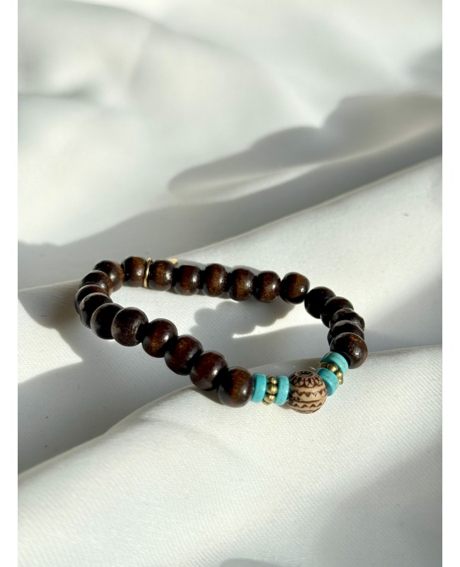 Dodaj do swojego stylu odrobinę charakteru dzięki tej wyjątkowej bransoletce wykonanej z ciemnych, naturalnych drewnianych koralików. Centralny element – jasny koralik z etnicznym, ręcznie rzeźbionym wzorem – przyciąga wzrok i nadaje całości niepowtarzalnego klimatu. Delikatne turkusowe i złote przekładki subtelnie przełamują ciemną kolorystykę, tworząc harmonijną, stylową kompozycję.